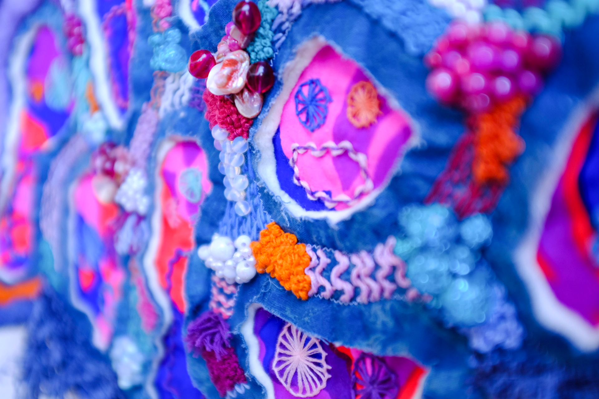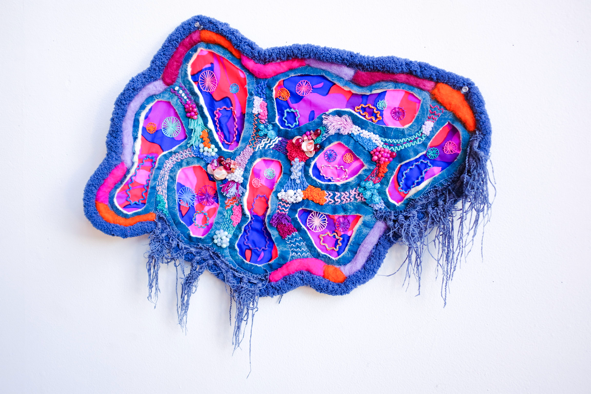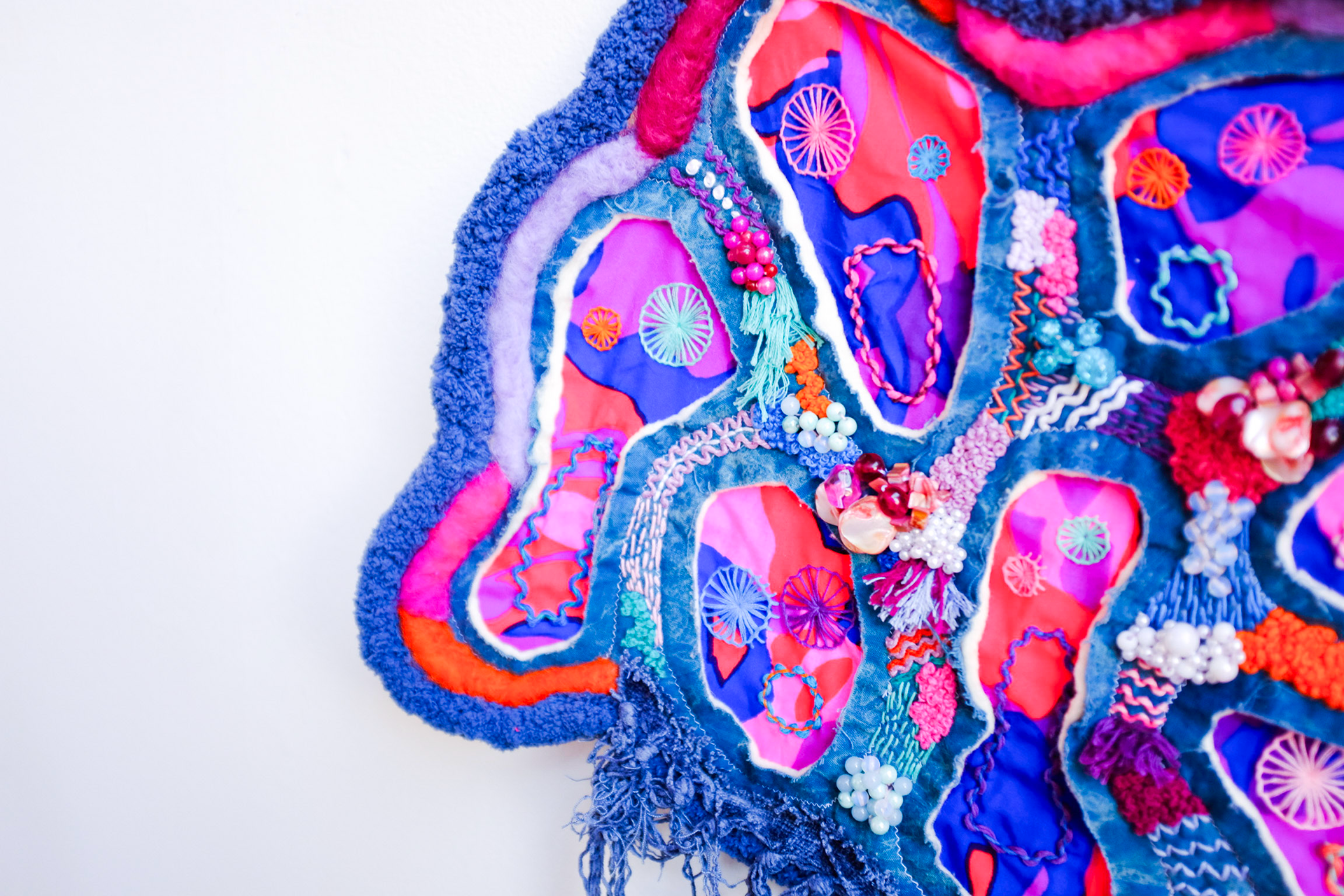 Repurposed scrap fabric and secondhand thread, beads, roving, and yarn.
