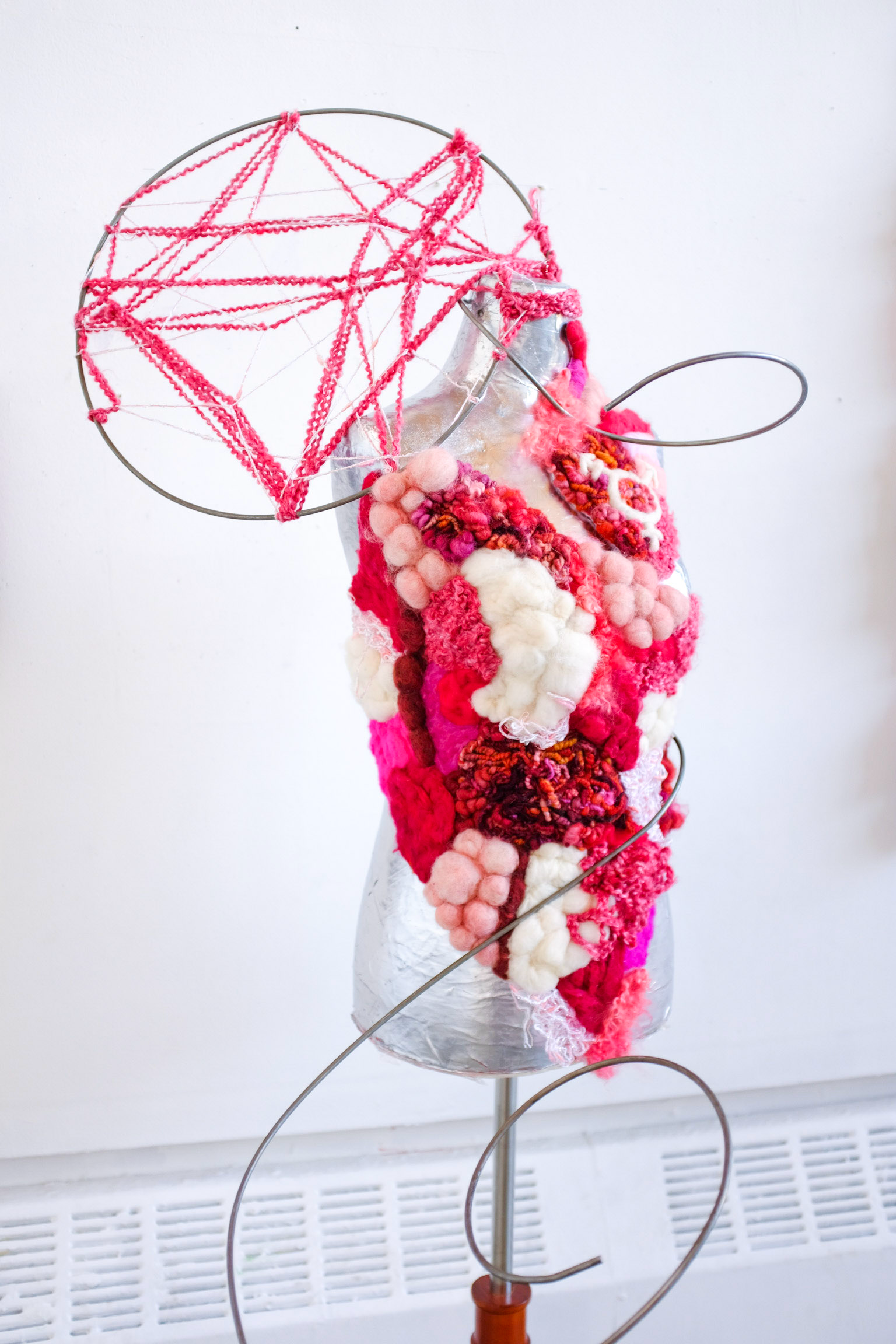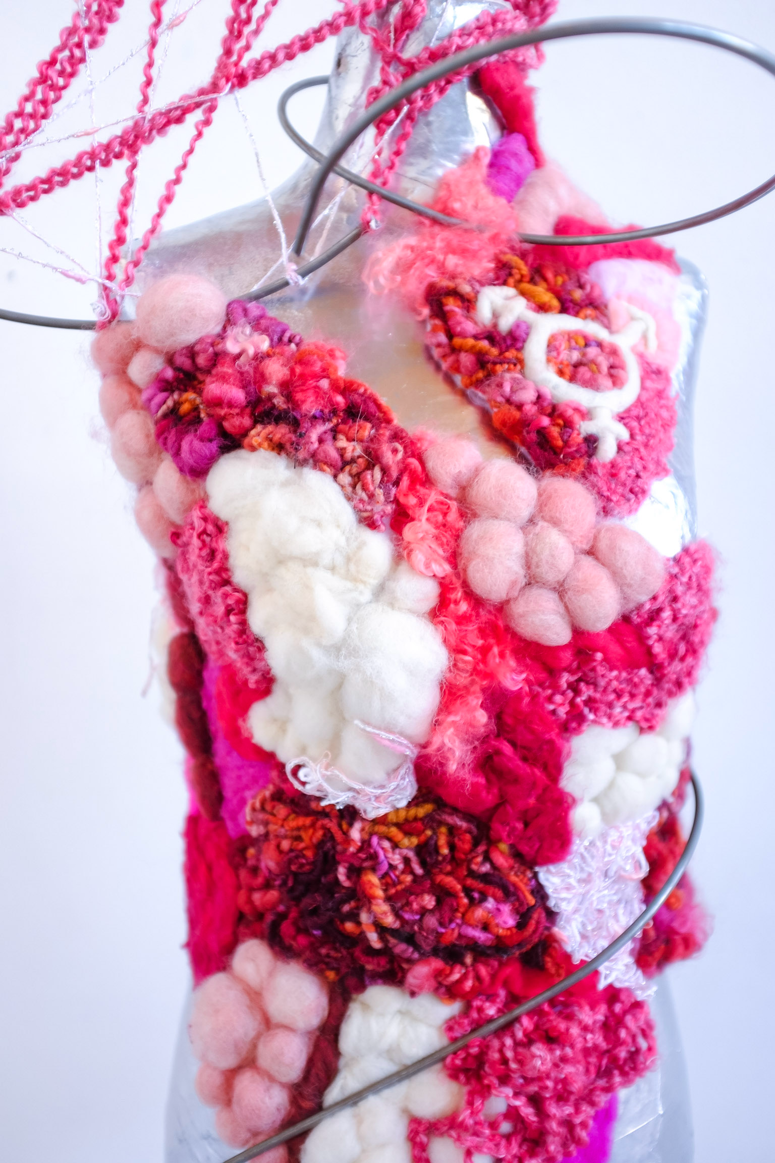 Mix of secondhand and locally-sourced wool roving, yarn, felt, steel, newspaper, spray paint, yarn, foam mannequin. 68.5" x 27" x 38".