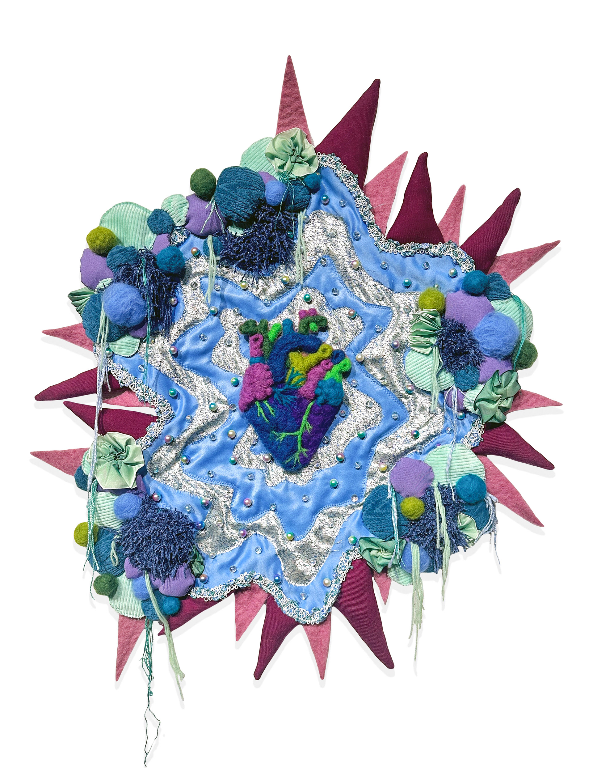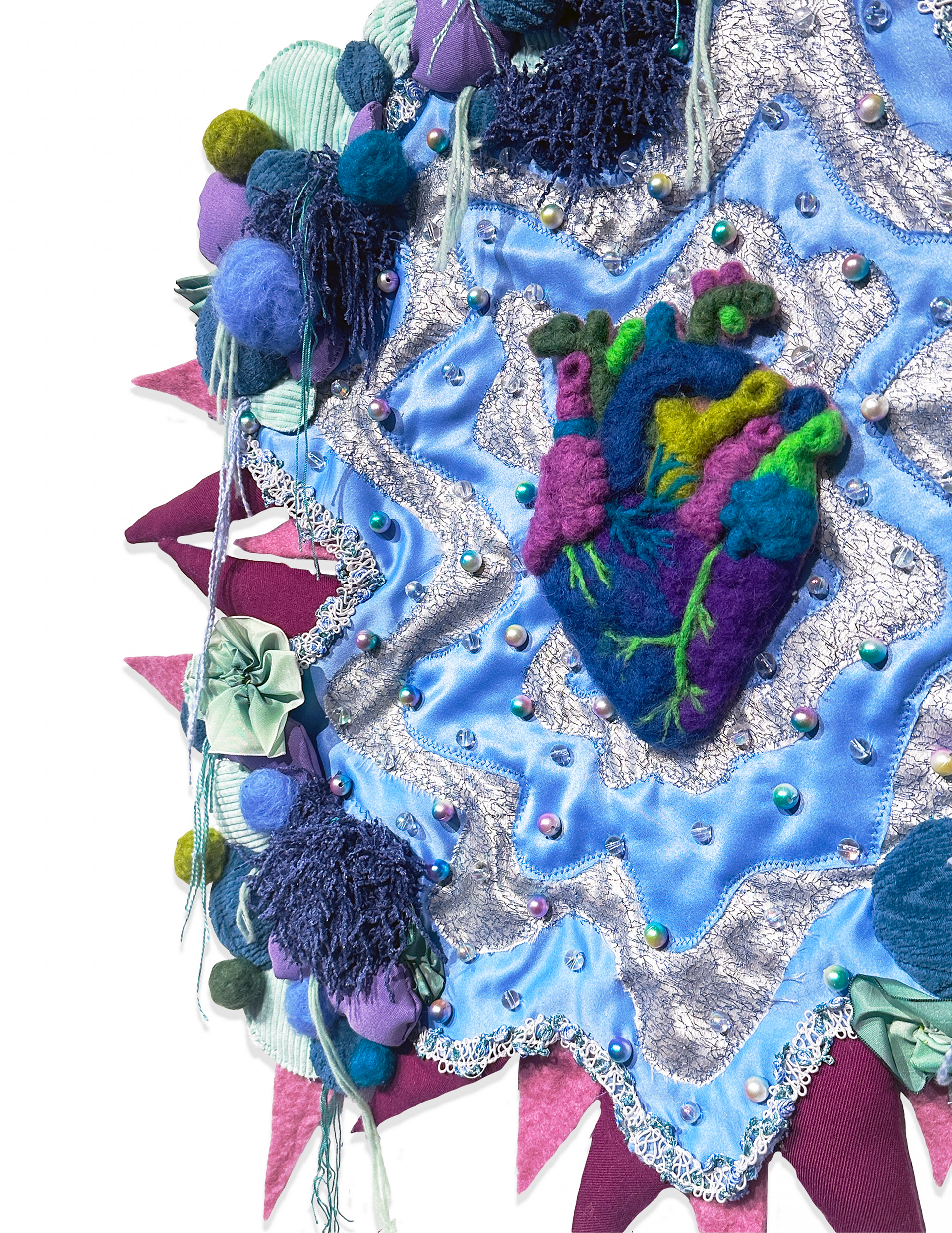 Repurposed Scrap Fabrics, Blankets, Wool, Ribbon, Beads. 29" x 27".