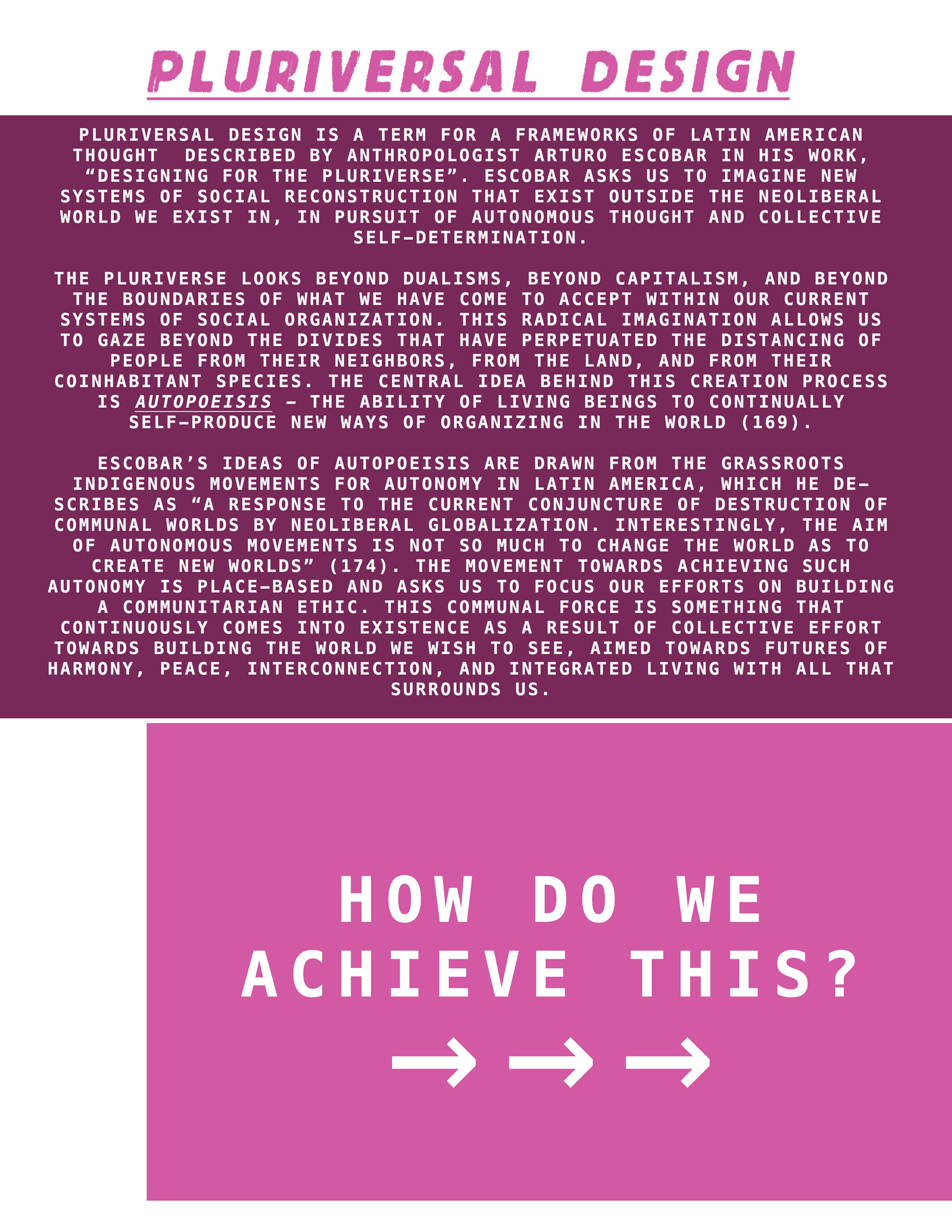 A zine made for my environmental philosophy course, based on the work of Arturo Escobar.